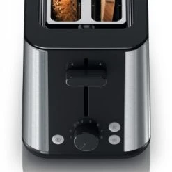 Die Aufwärm-, Stop- und Auftauftasten sind von oben am Toaster zu bedienen. Die Röstgradeinstellung und Hebetaste sind an der Seite des Toasters positioniert.