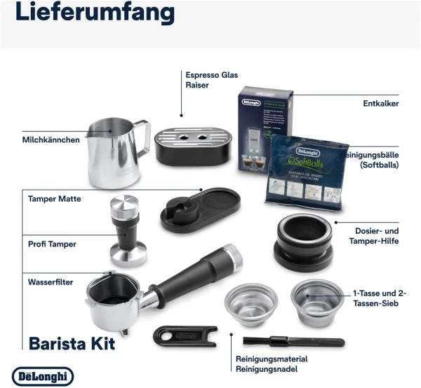 Im Lieferumfang inklusive ist ein komplettes Barista-Kit: ein schwerer Edelstahl Tamper, eine Tamping Matte, ein Dosierhilfe und ein Tamping Guide, sowie ein Edelstahl Milchkännchen und 2 einwandige Filtersiebe für 1- und 2 Tassen.