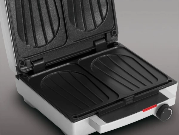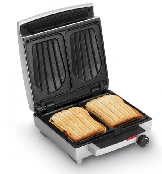 Bereiten Sie herrliche Croques für die ganze Familie mit dem kompakten FRITEL Sandwich Maker SW1450. Die festen Platten in massiven Aluminium-Druckguss verfügen über Antihaftbeschichtung für ein perfektes Ergebnis. Der SW 1450 ist mit COOL TOUCH Handgriffen, einem stufenlosen, verstellbaren Thermostat, einer Kontrolllampe und einer Verriegelungsfunktion ausgestattet, damit Sie auch gefüllte Croques bereiten können. Schlieβlich können Sie das Gerät optimal vertikal lagern.