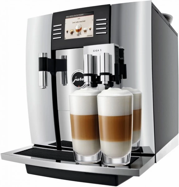 Die GIGA 5 steckt voller technischer Innovationen. Dank zwei Keramikscheibenmahlwerken, zwei Heizsystemen, zwei Hochleistungspumpen, zwei Flowmetern, und zwei Fluidsystemen schafft es das neue Flaggschiff der JURA-Flotte, zwei Kaffee-Spezialitäten auf einmal zu servieren. Zudem arbeiten die fast geräuschlosen Mahlwerke autonom. Dies bedeutet für den Konsumenten zu Hause, dass er in die beiden Bohnenbehälter verschiedene Kaffeesorten füllen und so eine eigene, persönliche Kaffeemischung kreieren kann. Ganz einfach per Knopfdruck. Milchkaffee kann erstmals von einem JURA-Vollautomaten in Perfektion zubereitet werden. Sein Geheimnis liegt in der optimalen Mischung von Milch und Kaffee während der Zubereitung. Sie wird nur erreicht, wenn Milch und Kaffee gleichzeitig in die Tasse fließen. GIGA 5 ist in der Lage, synchron Kaffee zuzubereiten und Milch zu erhitzen, eine Disziplin, die bislang nur Profigeräte für die gehobene Gastronomie beherrschten. Zum Schluss krönt ein kleines Milchschäumchen das Trendgetränk. Kaffeequalität doppelt auf die Spitze getrieben: Mit der geballten Kraft von zwei Mahlwerken, zwei Heizsystemen, zwei Pumpen und zwei Fluidsystemen bereitet der Edelvollautomat selbstverständlich alle Kaffee- und Milchspezialitäten auf höchstem Niveau gleich zweifach zu. Flüsterleise und schnell: Zwei professionelle, nahezu verschleißfreie Keramikscheibenmahlwerke mit elektronischer Mahlgradverstellung garantieren über Jahre eine präzise, konstant gleichmäßige Mahlung. Milch und Kaffee gleichzeitig: Caffè Latte kann erstmals von einem JURA-Vollautomaten in Perfektion zubereitet werden. Sein Geheimnis liegt in der optimalen Mischung von Milch und Kaffee während der Zubereitung. Sie wird nur erreicht, wenn Milch und Kaffee gleichzeitig in die Tasse fließen. GIGA 5 ist in der Lage, synchron Kaffee zuzubereiten und Milch zu erhitzen, eine Disziplin, die bislang nur Profigeräte für die gehobene Gastronomie beherrschten. Zum Schluss krönt ein kleines Milchschäumchen das Trendgetränk. Direkt zum Ziel: Ein durchdachtes, intuitives Bedienkonzept mit TFT-Display, Rotary Selection und klar definierten Zubereitungstasten führt auf direktem Weg zum Hochgenuss. Viel Luft für viel Power: Wo sich die geballte Kraft zweier Mahlwerke, zweier Pumpen und zweier Heizsysteme auf engstem Raum entfaltet, entstehen Dampf und Hitze. Im harmonischen Zusammenspiel mit einer elektronisch gesteuerten Ventilation übernehmen markant geformte, verstellbare Venti Ports automatisch die Atemfunktion, indem sie Abwärme nach außen leiten und Frischluft zuführen. Baristaspezialitäten: Jetzt werden Sie im Handumdrehen zum Profi-Barista. Die Rezepte zu zwölf fantasievollen Kaffeekreationen sind über den Rotary Switch wählbar. Klar verständlich führt Sie die GIGA 5 mit Bild und Text durch sämtliche Zubereitungsschritte, damit Sie sich und Ihre Gäste mit aussergewöhnlichen Kaffeekreationen verwöhnen können. Ein Hochgenuss für jeden verwöhnten Gaumen – und das Auge genießt mit.