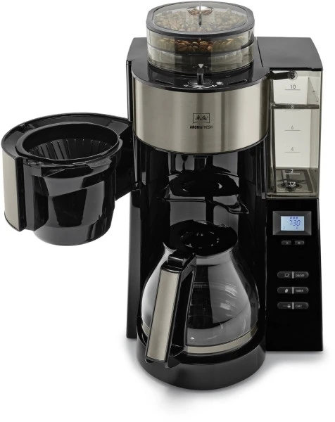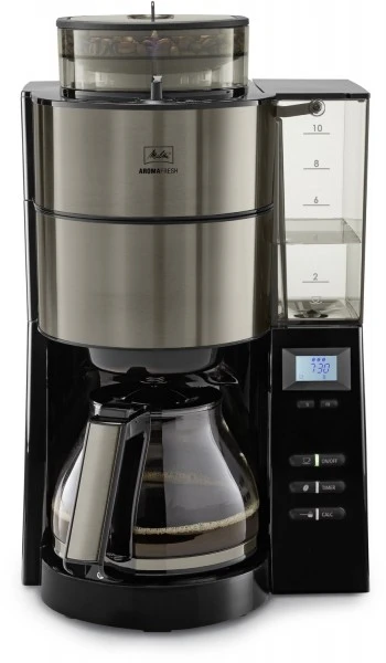 Maximale Aromen ohne Verzicht auf eine trendige Optik? Diese Variante der Melitta® Aromafresh Kaffeemaschine wird dank des metallischen Looks in jeder Küche zum Hingucker. Dank des integrierten Stahl-Kegelmahlwerk dieser Filterkaffeemaschine können zur Zubereitung Kaffeebohnen verwendet werden. Durch den Timer mit LCD-Anzeige kann der Filterkaffee zum gewählten Zeitpunkt minutengenau zubereitet werden. Für eine mühelose Reinigung sorgt das integrierte Entkalkungsprogramm. Für eine besonders gründliche Reinigung lassen sich Mahlwerksring und Bohnenbehälter entnehmen. Der Wassertank lässt sich für ein unkompliziertes Nachfüllen ebenfalls leicht entnehmen.