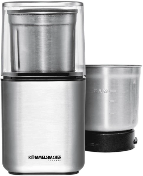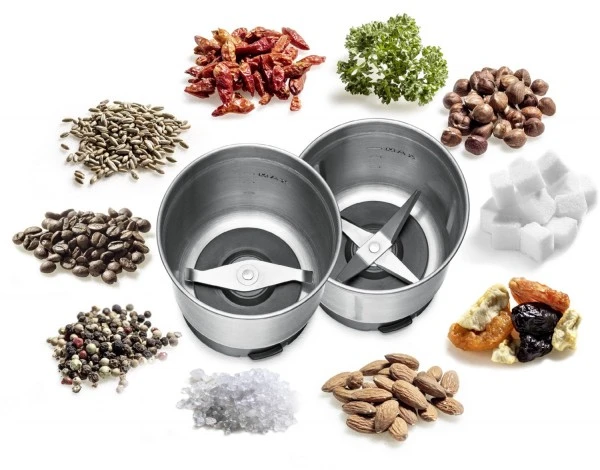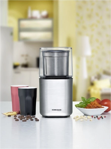Die elegante Gewürz & Kaffee Mühle von Rommelsbacher eignet sich perfekt zum Mahlen und Zerkleinern von Kaffeebohnen, Zucker, Gewürzen, Kräutern, Nüssen, Getreide und mehr. Die zwei unterschiedlichen Arbeitsbehälter ermöglichen eine sehr variable Nutzung: Im Mahlbehälter stellt man frisch gemahlenes Kaffeepulver her und zermahlt im Nu getrocknete Gewürze wie Pfefferkörner, Koriander und Kümmel, aber auch Zucker und Salz. Im Universalbehälter lassen sich frische Kräuter zerkleinern oder eine kleine Portion frisches Pesto zubereiten. Die abnehmbaren Behälter sind aus robustem Edelstahl und somit sehr reinigungsfreundlich. Die Mühle wird über einen Impulsschalter durch Drücken des Gerätedeckels ein- bzw. ausgeschaltet und ist daher angenehm einfach zu bedienen. Ein attraktives Gerät – perfekt für die anspruchsvolle Küche.